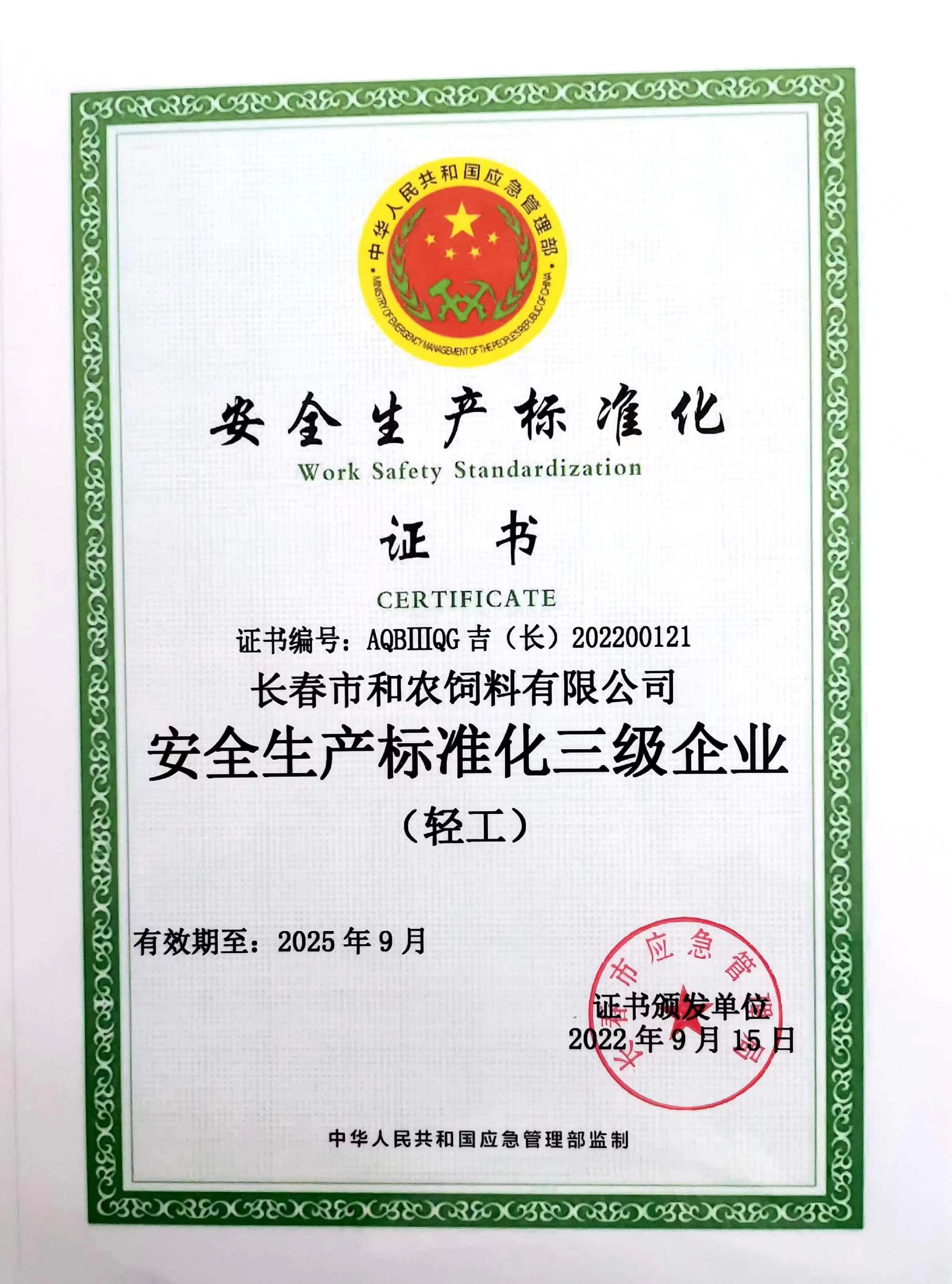 和農(nóng)牧業(yè)集團(tuán)下屬公司 長(zhǎng)春市和農(nóng)飼料有限公司榮獲由長(zhǎng)春市應(yīng)急管理局頒發(fā)、中華人民共和國(guó)應(yīng)急管理部監(jiān)制的“安全生產(chǎn)標(biāo)準(zhǔn)化三級(jí)企業(yè)”證書,標(biāo)志著長(zhǎng)春和農(nóng)飼料安全生產(chǎn)標(biāo)準(zhǔn)化建設(shè)邁上新臺(tái)階。