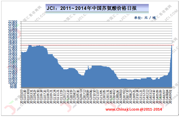 據(jù)JCI統(tǒng)計數(shù)據(jù)顯示,自8月下旬以來,我國蘇氨酸市場價格大漲9500元/噸,上漲幅度為78.51%,截至本周初市場平均價格達到21600元/噸,部分地區(qū)市場偏高報價為22000-23000元/噸,短期價格以及上漲幅度均為近幾年的最高點,詳見下圖所示。