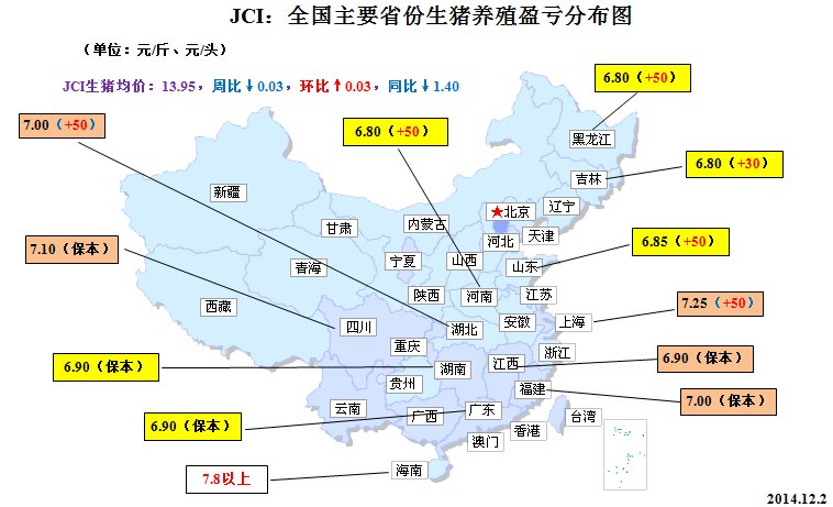 來(lái)自中國(guó)農(nóng)業(yè)部最新發(fā)布的統(tǒng)計(jì)報(bào)告--《2014年11月第2周(總第46周)畜產(chǎn)品、飼料集市價(jià)格》顯示,截至11月12日,全國(guó)生豬市場(chǎng)均價(jià)在14.10元/公斤,仔豬均價(jià)為21.51元/公斤,豬肉均價(jià)為23.19元/公斤,較10月均值分別下跌2.22%、8.19%和1.75%。盡管11月份我國(guó)生豬、仔豬和豬肉(白條肉)市場(chǎng)價(jià)格呈現(xiàn)全面回調(diào)格局,但是由于國(guó)內(nèi)豆粕、玉米包括相關(guān)飼料原料成本近來(lái)明顯回落,生豬價(jià)跌勢(shì)相對(duì)于飼料成本降幅較為溫和,全國(guó)大多數(shù)地區(qū)的養(yǎng)殖戶(場(chǎng))仍然維持保本或微利狀態(tài)。如前文所述,進(jìn)入12月份我國(guó)生豬市場(chǎng)依然存在需求推動(dòng)型的反彈空間。
